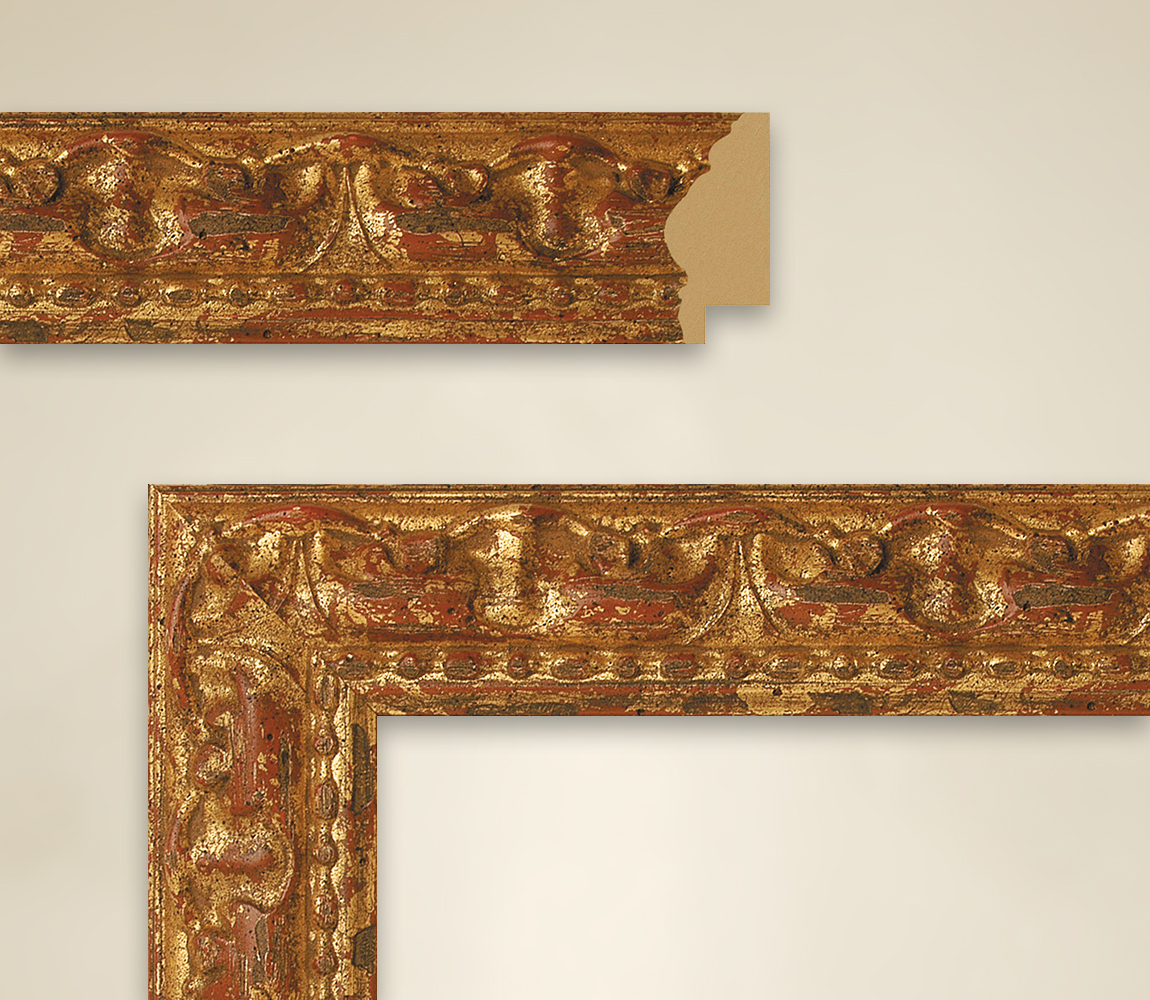 Lorenza bilderammen er en klassisk gullramme med ornamenter. Den virkelige trerammen skinner gjennom påføring av farging i gull med røde elementer. Og det over hele størrelsen, som er 49 millimeter bred og 20 millimeter høy. Lorenza bilderammen fungerer som en enkelt ramme på veggen så vel som i kombinasjon med andre av sitt slag - fordi du ikke kan ha nok gullrammer som kunstelsker. Lorenza vil tilpasse seg dette og fortsatt utstråle sin egen personlighet. Umiddelbart etter den smale endelisten på ytterkanten er det et bredt stykke som sprenges av ornamenter. Her kan betrakteren la fantasien løpe løpsk - uansett om det er et barokkbåndverk eller blomsterelementer. En smalere stang følger, og viser runde kjedeledd som danner en rad ved siden av hverandre, før Lorenza ender med en rett endestang. Det skinnende gullet skinner på dem alle, og skaper en antikk atmosfære med rødbrune aksenter. |