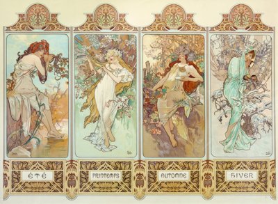 Noen steder kan du finne repetisjoner og svekkelser i arbeidet hans, for eksempel i produksjonen av enorme antall postkort og plakater. Bare noen få endringer i utformingen av figurene kan bli lagt merke til. Gester, ansiktsuttrykk og dekorasjoner er modifisert; bakgrunnen besto av sirkler eller buer. Men verkene til Alphonse Mucha har også slående elementer. Kunstneren utviklet sin egen stil, som han eksperimenterte med: de tydelige linjene, ornamentikken og fargeleggingen gjorde en typisk skildring av en kvinne med blomster unik.