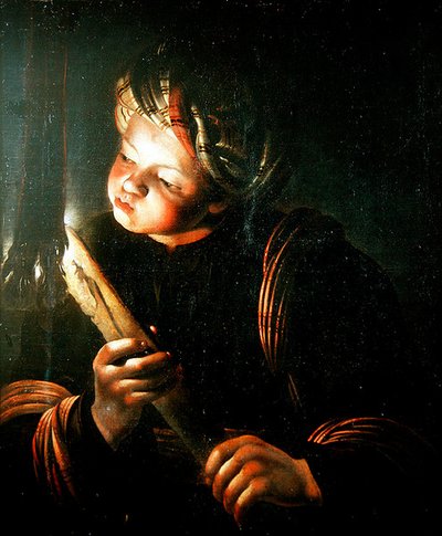 Young boy blowing on an ember