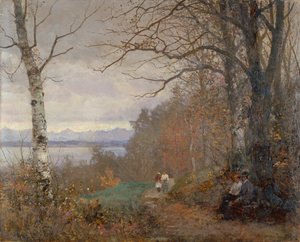 (A Wooded lake Landscape with Figures seated on a Bench (oil on canvas))Anders Andersen-Lundby |