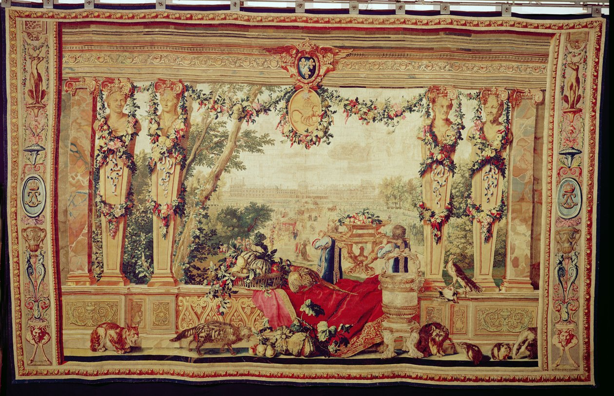 The Month of October Chateau of the Tuileries, fra serien med billedvev 'The Months or Royal Residences', produsert i Gobelins Workshop for Louis XIV (teppe)(The Month of October Chateau of the Tuileries, from the series of tapestries 'The Months or Royal Residences', produced in the Gobelins Workshop for Louis XIV (tapestry))Charles Le Brun |