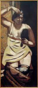 Dette arbeidet ble skapt under den kreative høyfasen i kunstnerens korte liv Egon Schiele. Noen år tidligere utviklet Schiele sin ekstraordinære og avantgarde tegneserie, som gjorde ham til en av de viktigste og enestående kunstneriske personlighetene i forrige århundre. I sine umiskjennelige illustrasjoner utforsket han mulighetene til å uttrykke kroppen langt fra det tradisjonelle skjønnhetsidealet. Han motarbeidet skjønnhetskulten til den wienske modernismen, som var dominerende på den tiden, med den stygge, groteske og forvrengte og dermed avanserte til muligens den første enfant forferdelig av modernismen. Illustrasjonen av den stående kvinnen med et blått skjerf illustrerer Schieles karakteristiske tegningsstil. Figuren til den slanke damen virker deformert og avmagret av de fragmenterte og skarpe kantene. Inntrykket av sykelighet og svakhet forsterkes av de nervøse og skjøre linjene. Skikkelig utførte fargeaksenter, som pryder hele kvinnekroppen i lysegrønne, blå og røde toner, får den til å se voldsom og utslitt. Avmagret og trakk seg, hun ser ned på bakken. Den monokrome bakgrunnen får dem til å virke isolert fra omverdenen. Likevel formidler de lyse rødfargede leppene og brystvortene en delikat erotikk i motsetning til lysfargen. Det antagonistiske emnet erotikk og død er også et ledemotiv i Schieles verk. Filigranlinjene, som på visse punkter er markert med brå fremspring og hakk, representerer en stilistisk komponent i Schieles kunstneriske arbeid. Han manipulerer de nakne tegningene gjennom ettertrykkelig uttrykksfulle bevegelser for å formidle et psykologisk ladet kroppsspråk. Fagene tragedie og deformasjon tjener også til å overføre mentale tilstander til kunstneriske komposisjoner. Generelt hadde han stor interesse for psykologiske grenseopplevelser og kroppsspråket til psykisk syke mennesker. Schieles eksplisitte skildringer av erotikk og seksualitet parret med forvrengte, bøyd kropp med ofte avskårne ekstremiteter, brøt den tidens kunstneriske og moralske konvensjoner, slik at han til og med ble dømt til fengsel for å "spre umoralsk tegning". I dag henter hans verk topppriser på det internasjonale kunstmarkedet.