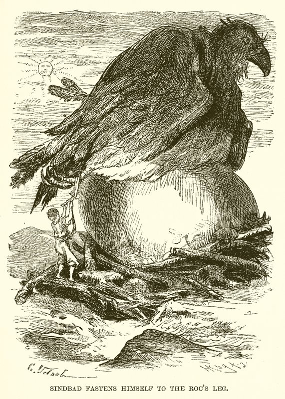 Sindbad fester seg til Rocs Leg(Sindbad Fastens himself to the Rocs Leg )English School |