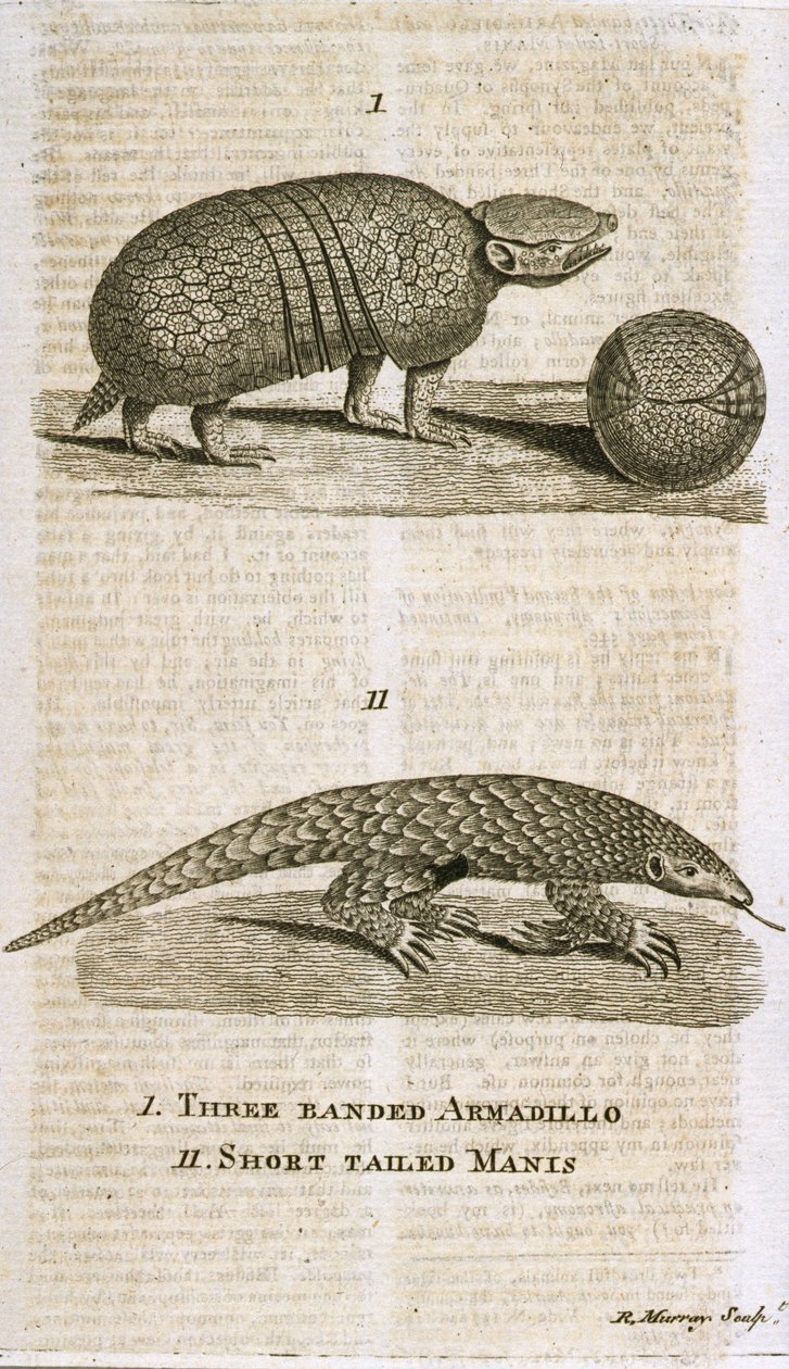 Three Banded Armadillo and Short Tailed Manis, fra 'The Gentleman's Magazine', utgitt ca. 1773, gravert av R. Murray(Three Banded Armadillo and Short Tailed Manis, from 'The Gentleman's Magazine', published c.1773, engraved by R. Murray )English School |