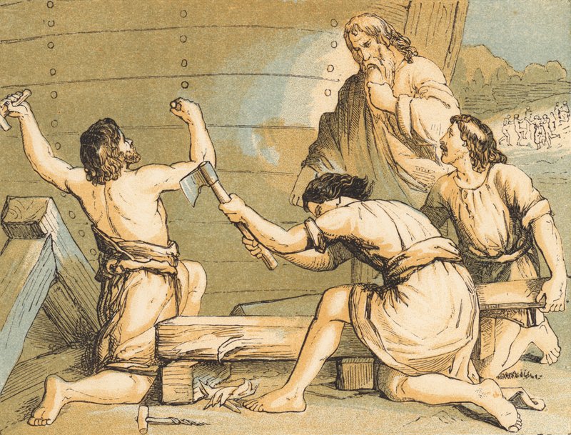 Noah bygger arken (farget gravering)(Noah building the Ark (coloured engraving))English School |