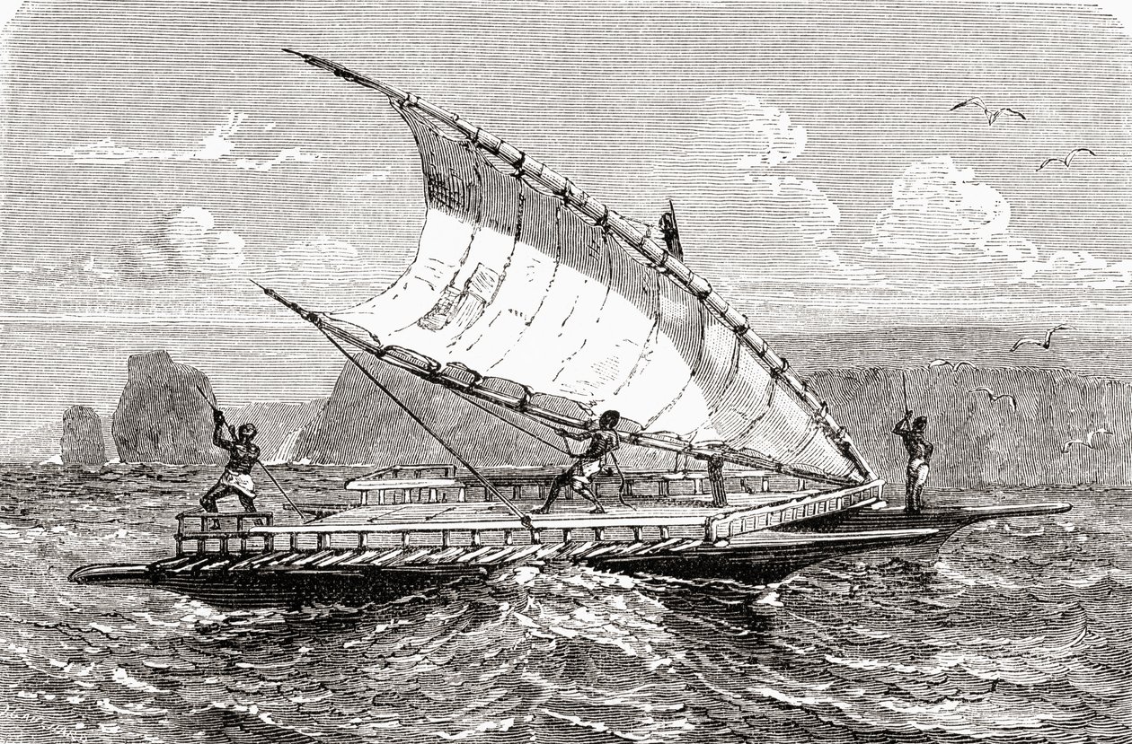 Ny kaledonsk dobbeltkano, fra 'El Mundo en la Mano', utgitt 1878(New Caledonian double canoe, from 'El Mundo en la Mano', published 1878 )European School |