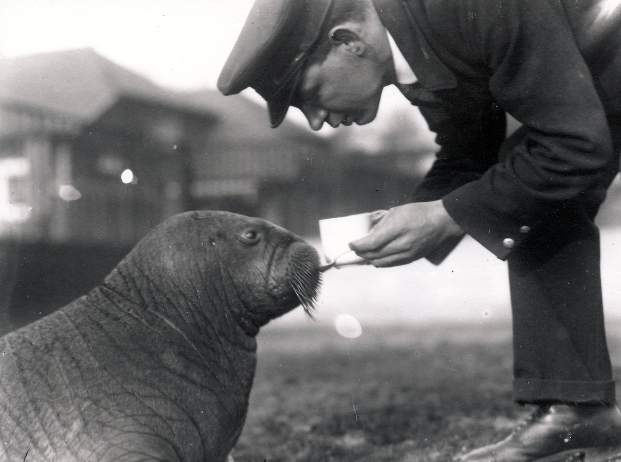 Keeper Arthur Chandler gir tran til en hvalross, 1923(Keeper Arthur Chandler giving cod liver oil to a walrus, 1923 )Frederick William Bond |