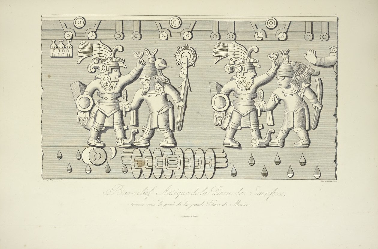 Aztec Stone Relief of Sacrifices, illustrasjon fra Views of the Cordilleras and Monuments of the Native Peoples of America av Alexander von Humboldt og Aime Bonpland, 1813(Aztec Stone Relief of Sacrifices, illustration from Vues des Cordillères et Monumens des Peuples Indigènes de lAmérique by Alexander von Humboldt and Aime Bonpland, 1813 )French School |