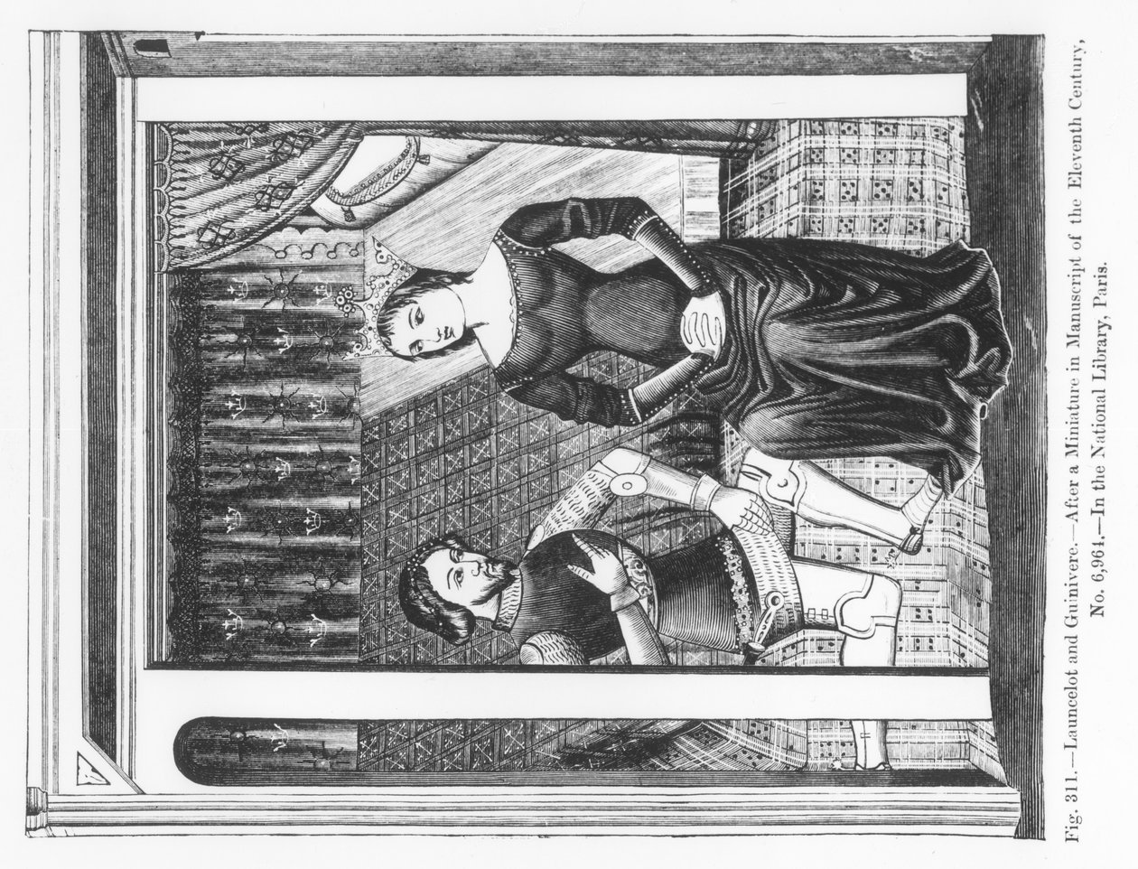 Lancelot og Guinivere, fra et manuskript som inneholder Arthurian Legend, illustrasjon fra 'Vitenskap og litteratur i middelalderen og renessansen', skrevet og gravert av Paul Lacroix, 1878 (no(Lancelot and Guinivere, from a manuscript containing the Arthurian Legend, illustration from 'Science and Literature in the Middle Ages and Renaissance', written and engraved by Paul Lacroix, 1878 (en)French School |