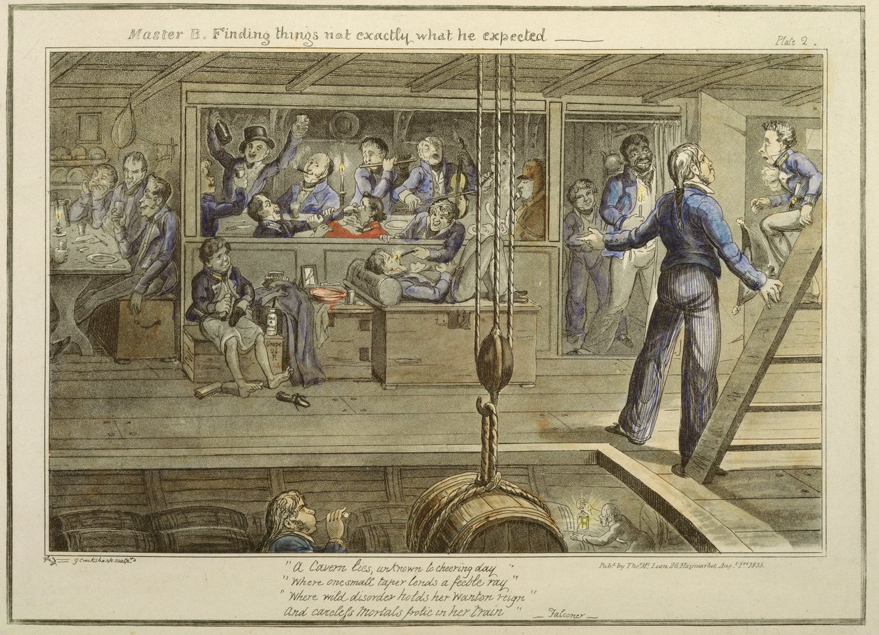 Mester B fant ting som ikke var akkurat det han forventet, fra 'The Progress of a Midshipman', utgitt av Thomas McLean, 1. august 1835 (farget akvatint)(Master B finding things not exactly what he expected, from 'The Progress of a Midshipman', published by Thomas McLean, 1st August 1835 (coloured aquatint))George Cruikshank |