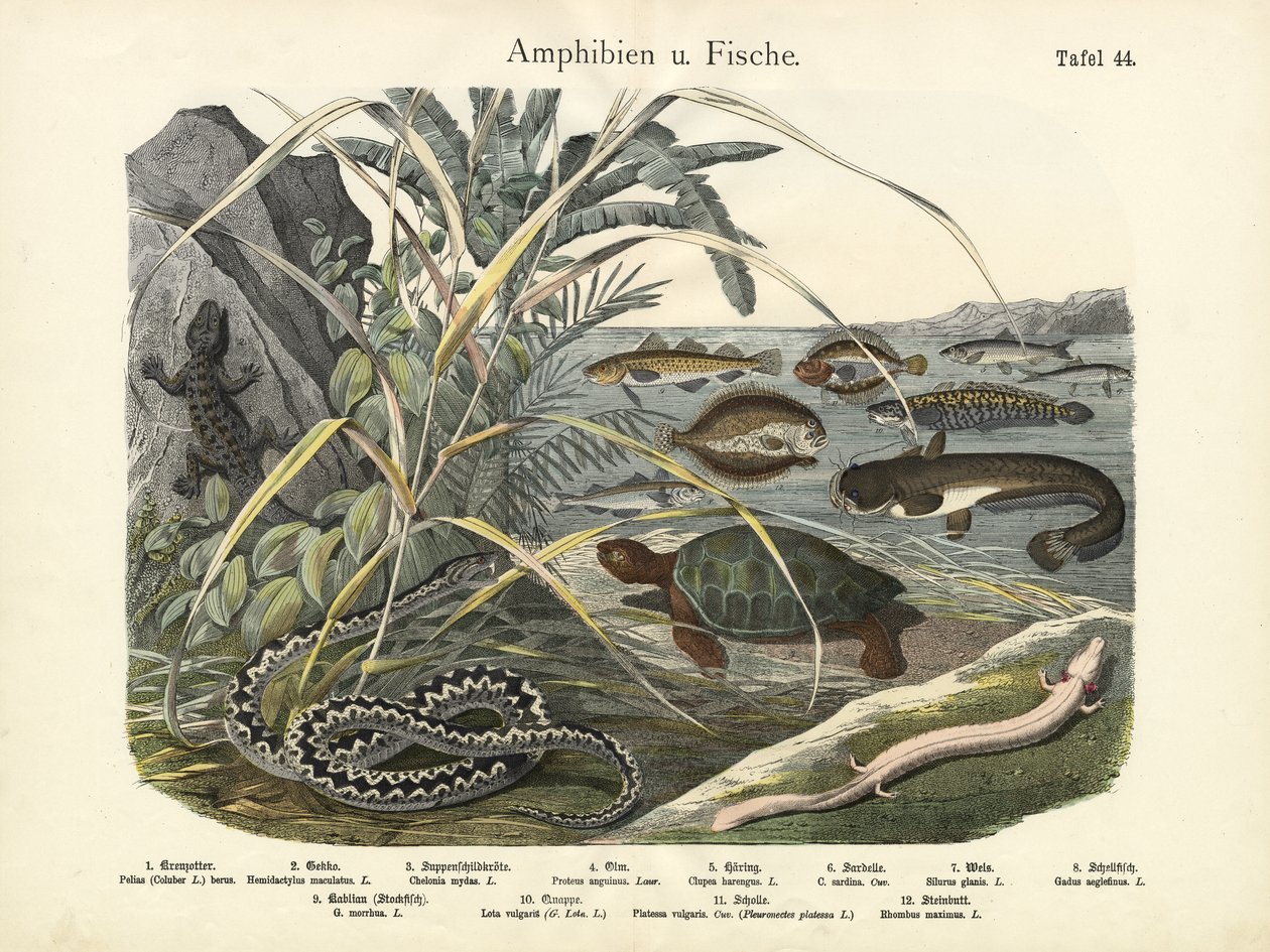 Amfibier og fisker, ca. 1860(Amphibians and Fishes, c.1860 )German School |