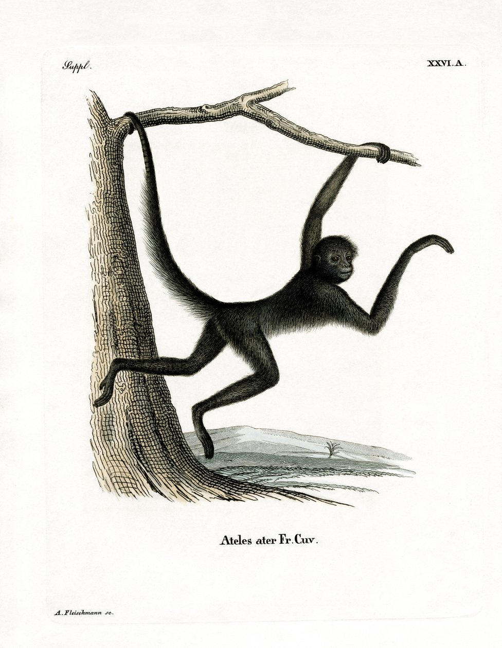 Spider Monkey (farget gravering)(Spider Monkey (coloured engraving))German School |