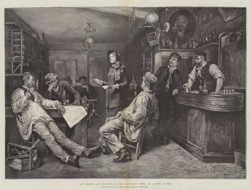 En engelsk dame-predikant av Frelsesarmeen, i en sveitsisk taverna(An English Lady-Preacher of the Salvation Army, in a Swiss Tavern )Gustaf Olaf Cederstrom |