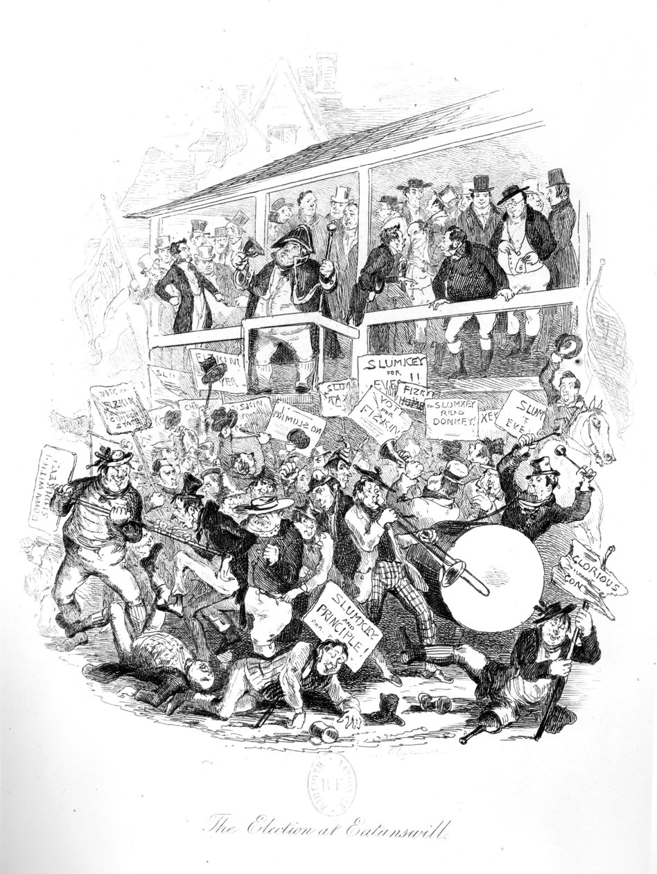 Mr Pickwick på valgdagen i Eatenswill, illustrasjon fra 'Pickwick Papers' av Charles Dickens (1812-70)(Mr Pickwick on Election Day at Eatenswill, illustration from 'Pickwick Papers' by Charles Dickens (1812-70) )Hablot Knight Browne |