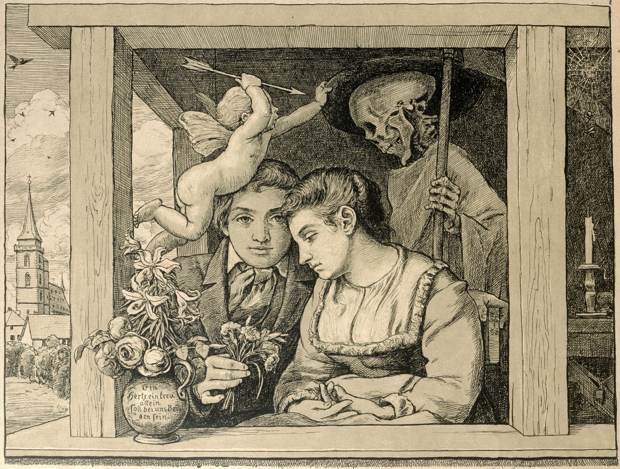 Reaper Death (Love and Death, The Newly-weds) 1896 (gravering på brunt papir)(Reaper Death (Love and Death, The Newly-weds) 1896 (engraving on brown paper))Hans Thoma |