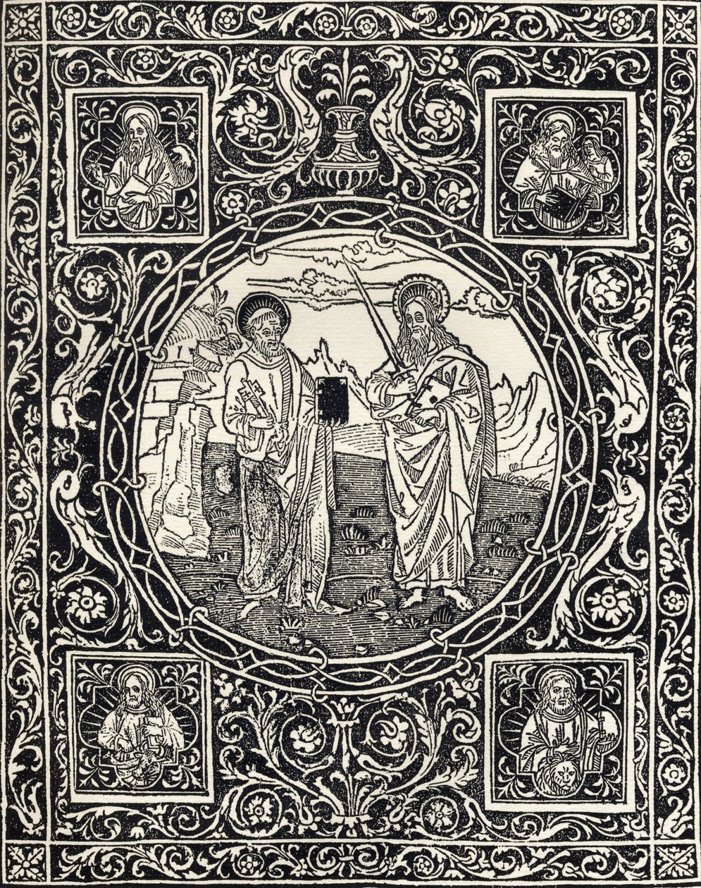 SS. Peter og Paul og de fire evangelistene, fra 'A Catalog of a Collection of Engravings, Etchings and Woodcuts', av Richard Fisher, utgitt 1879(SS. Peter and Paul and the Four Evangelists, from 'A Catalogue of a Collection of Engravings, Etchings and Woodcuts', by Richard Fisher, published 1879 )Italian School |