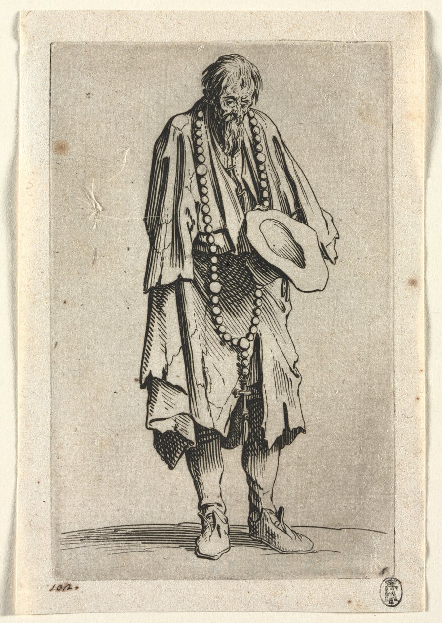 Tiggerne: Tigger med rosenkrans , ca. 1623.(The Beggars: Beggar with Rosary , c. 1623. )Jacques Callot |