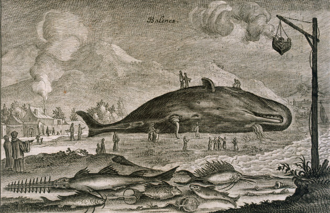 En strandbar spermhval med en rekke andre fisker fra kinesiske farvann, 1665(A beached sperm whale with a variety of other fish from Chinese waters, 1665 )Johannes Nieuhoff |
