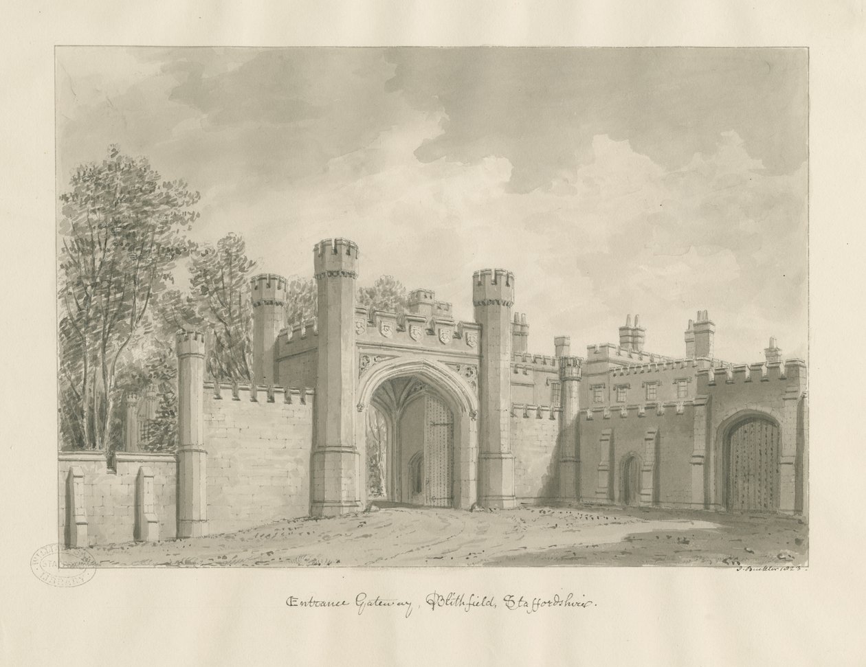 Blithfield Hall: sepia-tegning(Blithfield Hall: sepia drawing)John Buckler |