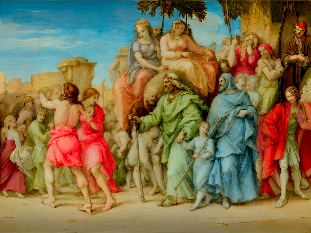 Dette bildet ble opprettet med hjelp av generativ AI. 2023 · Mischtechnik, KI, Collage, Paintings · Bilde ID: 1481519 Jakob flykter fra Laban med familien og buskapen. Jakob flykter fra Laban med familien og buskapen. Bildene er basert på offentlig domene svart-hvitt-graveringer av Julius Schnorr von Carolsfeld (publisert i 1860). De enkelte bildene ble utvidet på alle kanter, bildeinnholdet ble revidert, supplert og fargelagt i stil med de italienske renessansemalerne (Leonardo da Vinci, Titian, Botticelli). Bildene er basert på offentlig domene svart-hvitt-graveringer av Julius Schnorr von Carolsfeld (publisert i 1860). De enkelte bildene ble utvidet på alle kanter, bildeinnholdet ble revidert, supplert og fargelagt i stil med de italienske renessansemalerne (Leonardo da Vinci, Titian, Botticelli). Merk: alle mennesker er AI-generert og representerer ikke virkelige mennesker. Bildene ble deretter omhyggelig behandlet. Merk: alle mennesker er AI-generert og representerer ikke ekte mennesker. Bildene ble deretter omhyggelig bearbeidet.
