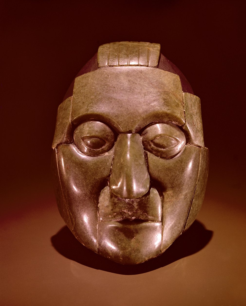 Mosaikkmaske som representerer en gammel mann, fra Ruz-graven under Inskripsjonenes tempel i Palenque, Chipas (jade)(Mosaic mask representing an old man, from the Ruz tomb under the Temple of the Inscriptions at Palenque, Chipas (jade))Mayan |