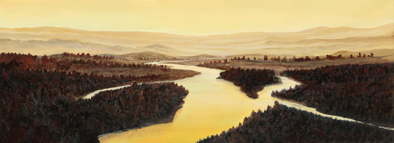 Mottoet til dette bildet er: quot;Design din verden slik du liker den.quot; Dette maleriet i langformat har en palett med jordfarger. Varme brune toner hviler sammen med gulaktige nyanser som reflekteres i elven og himmelen. Fargene i den øvre delen av himmelen finner sin korrespondanse i den brede elven i nedre midtre del av bildet. I det fjerne danner en fjellkjede forbindelsen mellom himmel og jord. Dette kunstverket ble laget fritt i studio, uten bruk av mal. Det dukket opp spontant, slik det ofte er i landskapsmaleriet. Selv om den mørkebrune skogen ikke er opparbeidet i detalj, gir den likevel et tydelig inntrykk. Representasjonen er i stand til å på imponerende vis formidle tilstedeværelsen av en skog. Originalen til dette maleriet er et oljemaleri på lerret fra 2020 som måler 30 x 90 cm. Den ble laget i kunstnerens atelier i Berlin-Mitte. Dette bildet er ideelt som kunsttrykk av høy kvalitet og kan berike ditt individuelle interiørdesign.