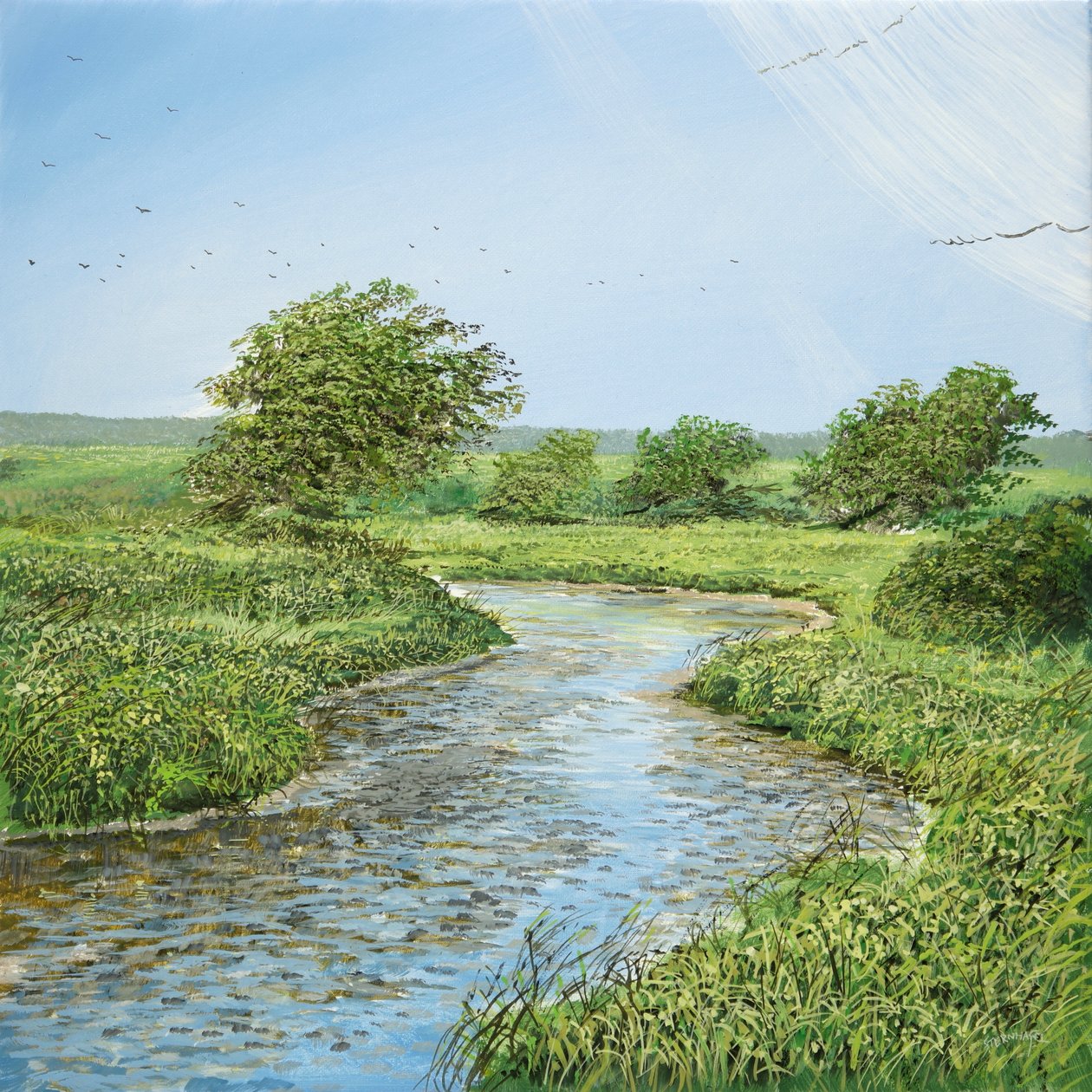 I dette lille og delikate oljemaleriet ser det ut til at en lett bris blåser forsiktig over landskapet, akkompagnert av noen få frittflygende fugler som glir gjennom luften. En gardin av delikat stoff flyter uanstrengt over scenen og åpnes av vindbrisen, og blir en slags magisk gardin som avslører dette fredelige landskapet. Trærne i dette maleriet er svakt buede og du kan nesten føle vindens påvirkning på formene deres. Her blir vinden den usynlige naturlige kraften i bildet, og bringer liv og bevegelse inn i scenen. Det er bemerkelsesverdig hvordan kunstneren klarer å skildre vinden indirekte gjennom utformingen av kulissene, siden vinden i seg selv ikke kan males direkte på lerretet. Opprettelsen av dette bildet skjer gjennom spontane impulser og kunstnerens kreative energi, som plasserer børsten på det hvite lerretet og fanger øyeblikkets dynamiske følelse. Dette stedet som er avbildet i maleriet eksisterer ikke i virkeligheten, men er en oppfinnelse av kunstneren som viser oss en harmonisk forbindelse mellom naturen og den kunstneriske fantasien. Maleriet med tittelen #39;Moving Air#39; er opprinnelig et oljemaleri på lerret fra 2019. Størrelsen på originalen er 30 x 30 cm. Gjennom profesjonell digitalisering kan til og med en meterstor utskrift produseres uten tap av kvalitet. Originalen ble laget i kunstnerens atelier i Berlin-Mitte. Oljemaleriet anbefales her som et kunsttrykk av høy kvalitet for din spesielle og individuelle romdesign.