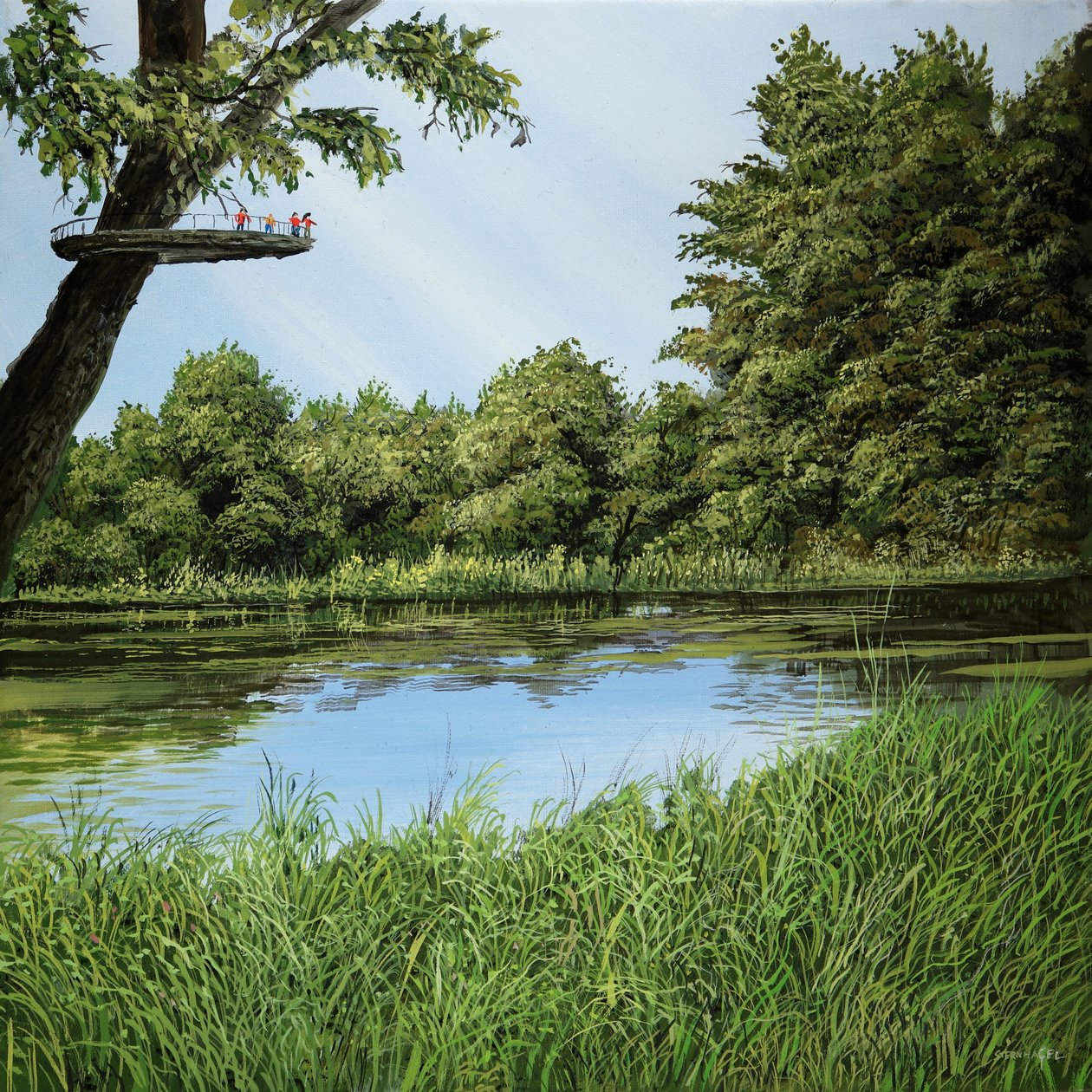#39;Mintered Garden#39; ligger i den sørlige delen av den engelske øya. Da jeg fanget dette fortryllende landskapet på stedet i skisser de siste årene, kunne jeg oppdage rikdommen i det engelske landskapet i sin reneste form. Dette maleriet i et lite format på 30 × 30 cm er blant annet et resultat av denne reisen og ble laget i mitt atelier. Det som er spesielt slående er plattformen med de fire personene på, som ser ned på dammen med nysgjerrighet og entusiasme. Menneskene er avbildet som små i forhold til naturen, nesten som dverger. Jeg vil gjerne illustrere forholdet mellom mennesker og natur. Kraften og størrelsen på naturen, hvis vi klassifiserer den riktig, er gigantisk for oss mennesker. Bildet ble laget basert på et bilde fra denne hagen. Den viser en dam, en naturlig eng i forgrunnen og trær i bakgrunnen. Dette maleriet fanger naturens prakt og fascinasjon, og de små figurene på plattformen minner oss om hvor bittesmå vi er sammenlignet med naturens overveldende skjønnhet. Maleriet med tittelen #39;Life in a Tree#39; er opprinnelig et oljemaleri på lerret fra 2019. Størrelsen på originalen er 30 x 30 cm. Gjennom profesjonell digitalisering kan til og med en meterstor utskrift produseres uten tap av kvalitet. Originalen ble laget i kunstnerens atelier i Berlin-Mitte. Oljemaleriet anbefales her som et kunsttrykk av høy kvalitet for din spesielle og individuelle romdesign.