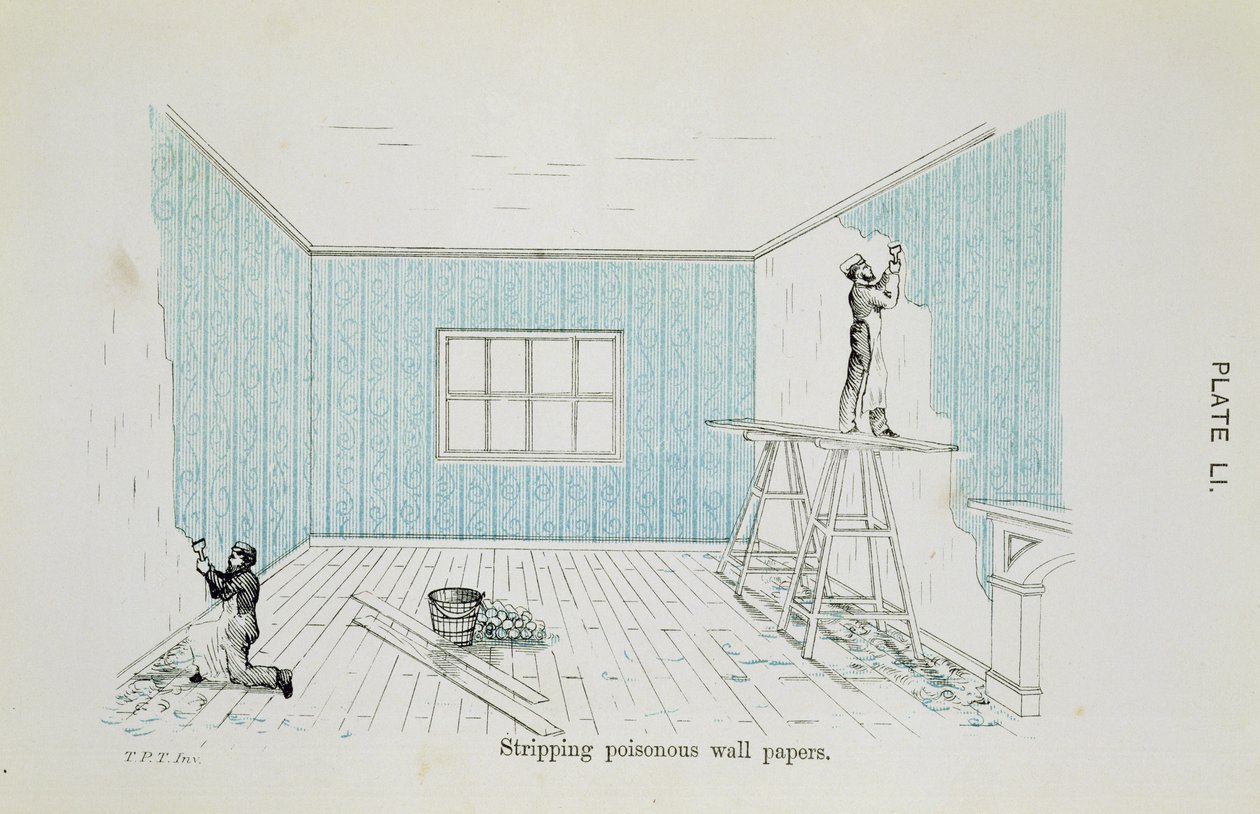 Fjerning av giftige tapeter, illustrasjon fra Dangers to Health: A Pictorial Guide to Domestic Sanitary Effects, publisert 1897(Stripping poisonous wall papers, illustration from Dangers to Health: A Pictorial Guide to Domestic Sanitary Effects, published 1897 )Thomas Pridgin Teale |