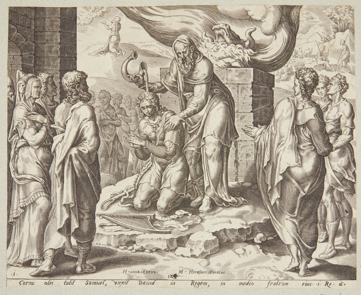 Samuel salver David(Samuel anointing David)Ubekendt efter Maarten van Heemskerck,Maarten van Heemskerck(after model by),Hieronymus Cock(publisher) |