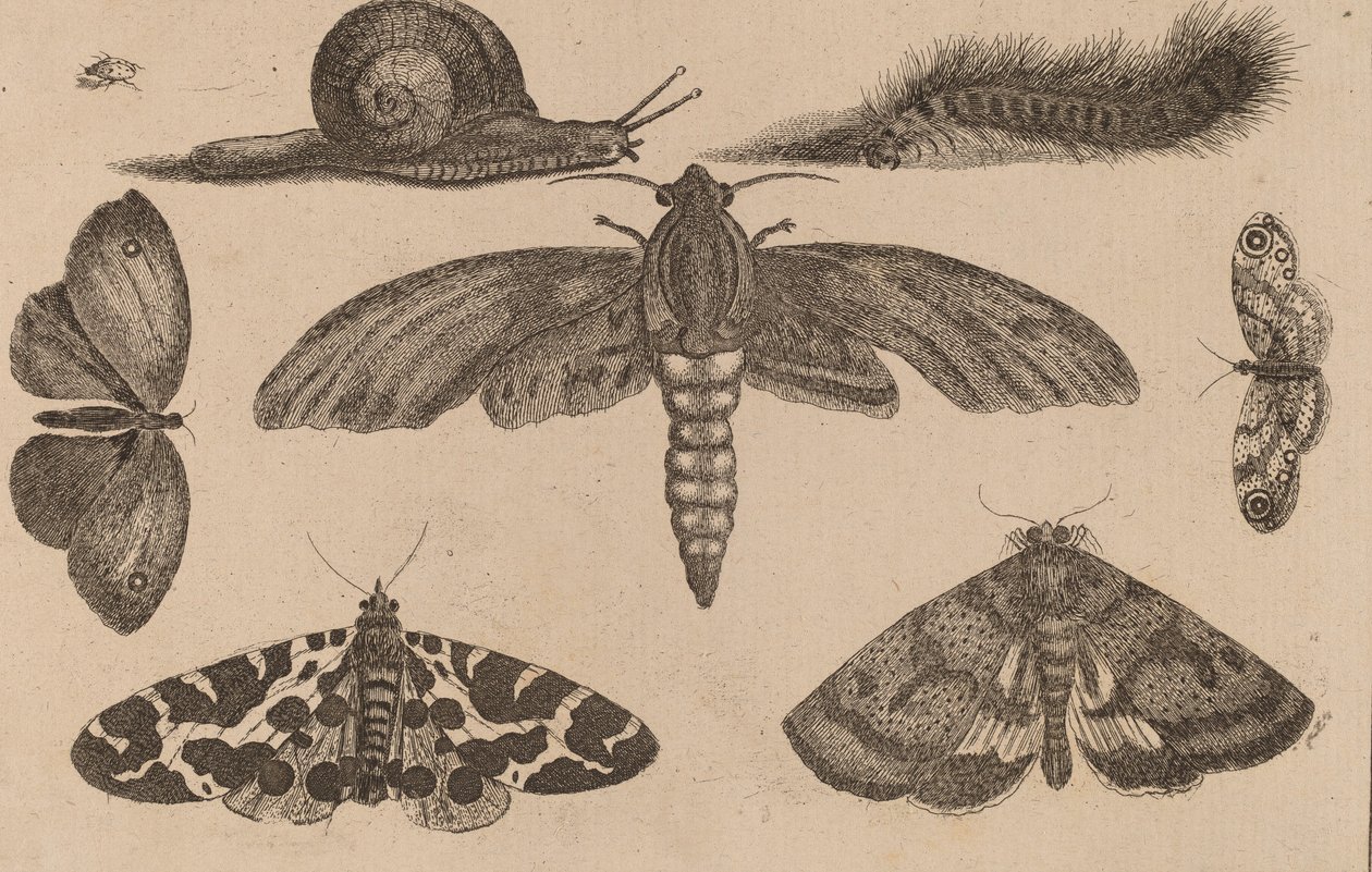 Seks insekter, en larve og en snegl.(Six Insects, a Caterpillar, and a Snail. )Wenceslaus Hollar |
