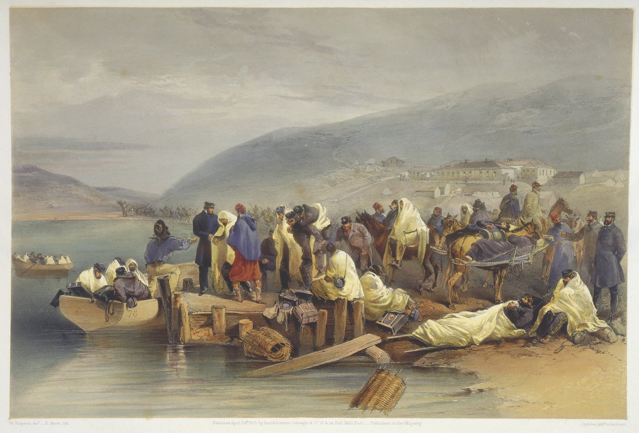 The Embarkation of the Sick at Balaklava, plate fra 'The Seat of War in the East', utgitt av Colnaghi and Co., 1856(The Embarkation of the Sick at Balaklava, plate from 'The Seat of War in the East', published by Colnaghi and Co., 1856 )William Crimea Simpson |