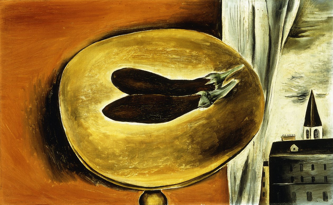 Stilleben med aubergine og bylandskap(Still Life with Eggplant and Cityscape)Yasuo Kuniyoshi |